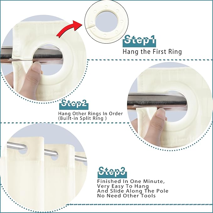 - SUPER EASY TO INSTALL : This shower curtains design with High Quality Flex On Rings that you can very easy to install it in one minute.Smart design will made it easier to hang and to slide along the pole.