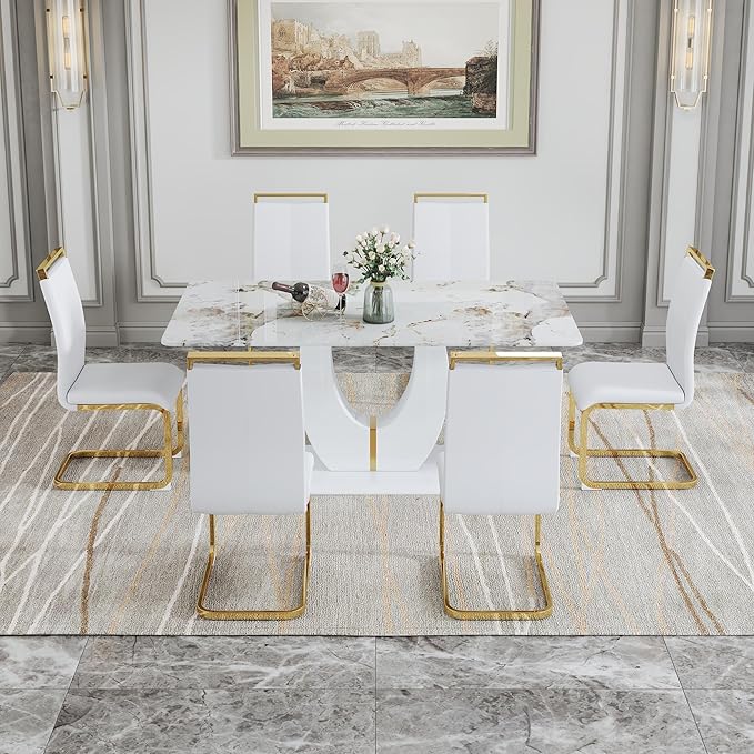 Dining Set for 6 - 71'' Faux Marble Table With PU Leather Upholstered Chairs for Kitchen and Dining Room (White-Golden)