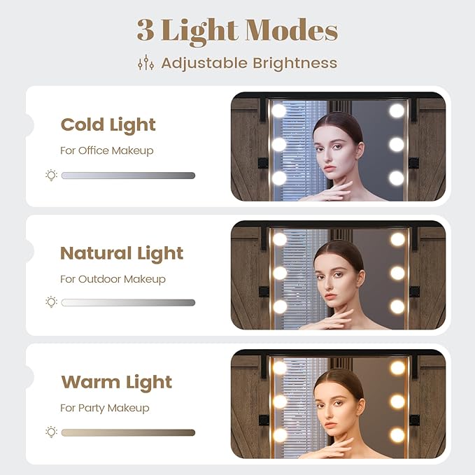 - 【Unique Perforation Technology for Mirrors】Unlike other products that punch holes in the wooden frame or expose wires directly on the mirror surface,AOGLLAT vanity table perforates directly on the mirror, allowing 8 Hollywood bulbs to be installed directly on the mirror; more refined and pretty. AOGLLATI vanity with 3 lighting modes (warm yellow, warm white, and cold white light colors) for you to choose.