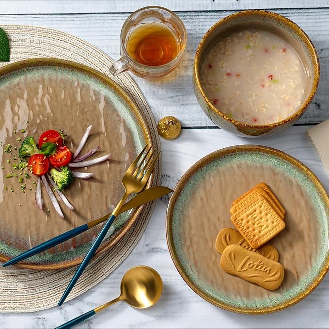 - HIGH QUALITY MATERIALS: Made of high-quality Grade A Stoneware with a reactive glaze finish. Our dinnerware set is built to last. Each piece undergoes rigorous quality control measures to make durability, resilience, and long-lasting beauty.