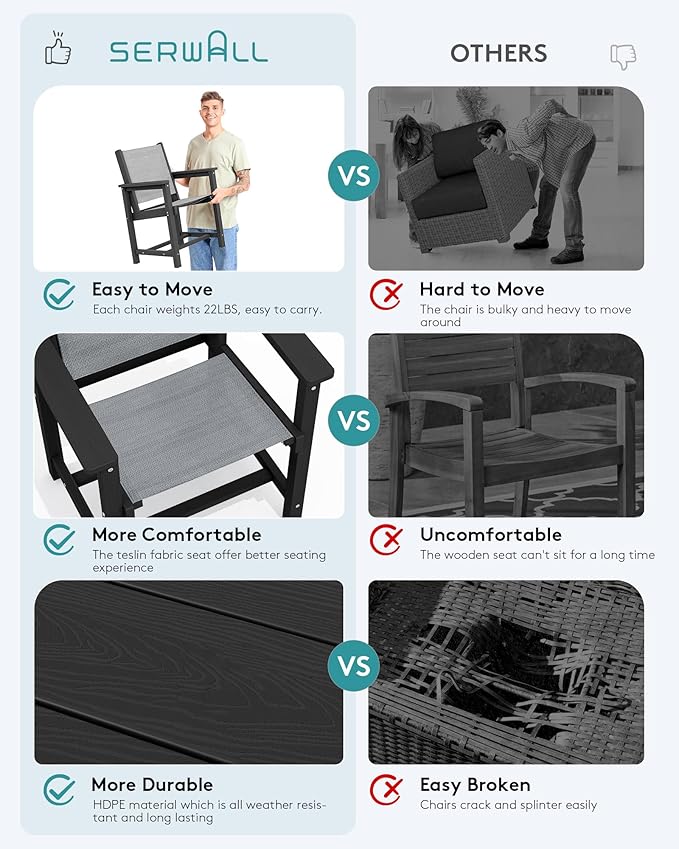 - 【Low Maintenance】HDPE dining table sets required low maintenance. Unlike the Steel dining sets may require rust prevention, SERWALL patio dining table and chairs are easy to clean with just soap and water, requiring minimal effort to keep them looking fresh.