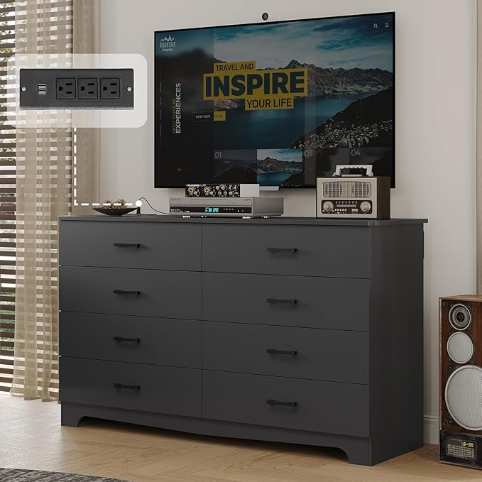 Hasuit 8 Drawer Dresser for Bedroom, Large Chest of Drawers with Charging Station, 55.1'' Wide Storage Clothes Closet Organizer, Long Dresser TV Stand for Living Room, Black