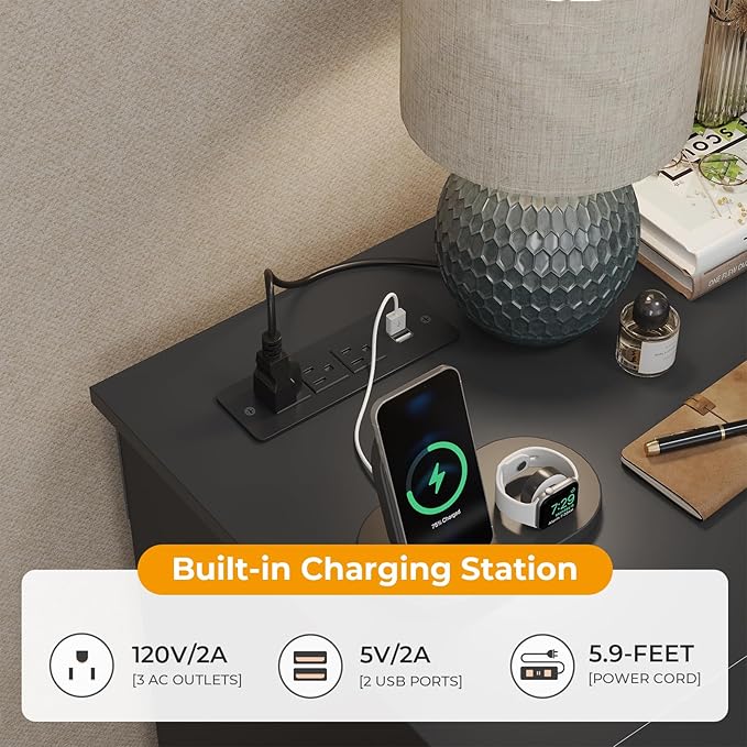 - 【Built-in Charging Station】 The power strip is located on the desktop of the dresser, which has 2 AC outlets, 2 USB ports, and a power switch. It is very convenient for powering devices, such as TV, desk lamp, laptop, phone, etc.