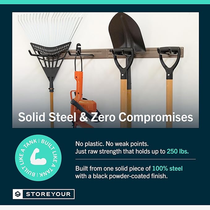- RECLAIM YOUR GARAGE – Conquer clutter with this garden tool organizer designed for garage storage, sheds, or workshops. Measuring 36" L x 9.5" W x 2.5" H, it features four PVC-coated garage hooks and a 250 lb weight capacity, ideal for storing shovels, brooms, rakes, and power tools. Installs with 3 heavy-duty lag screws directly into 16" wall studs for secure, long-lasting support.
