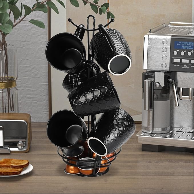 - COMFORTABLE TO HOLD: There is plenty of space between the handle and the coffee mug making it easy to hold. The pattern design also makes the black mugs comfortable to the touch. You can have coffee, tea, milk, and cocoa with this stylish mug set
