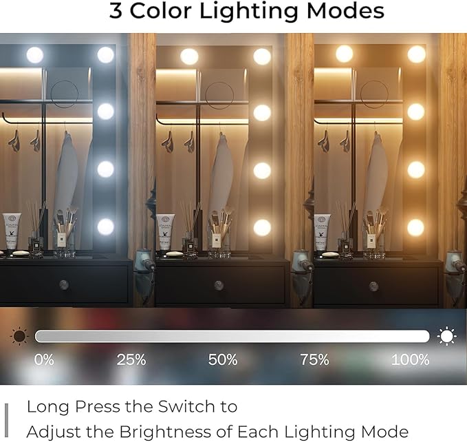 - 3 Lighting Modes & Brightness Adjustable: The vanity desk is equipped with an HD mirror and 11 bright Hollywood plastic bulbs, provides 3 color modes (warm/natural/cool) and adjustable brightness, this makeup vanity can meet all your different needs, perfect for home makeup, salon, and live broadcast., so you can experience the star-like makeup treatment.