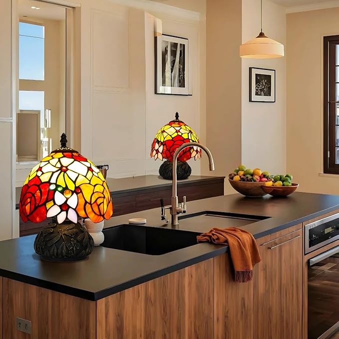 - 【 Small Stained Glass Lamp】This Tiffany lamp measures 8 inches in width and 11 inches in height. The lampshade is made of genuine stained glass, handcrafted with vibrant colors. The base is constructed from durable resin, ensuring sturdiness and reliable stability.