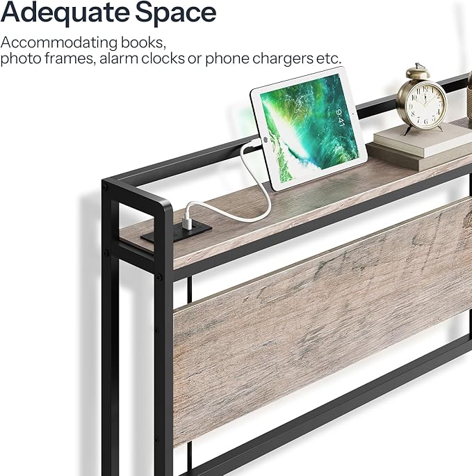 - Classic Design: Exquisite greige panel with black iron frame showcases a strong retro color. The thoughtful guardrail adds a unique design feel. This retro industrial style headboard can instantly elevate your home taste