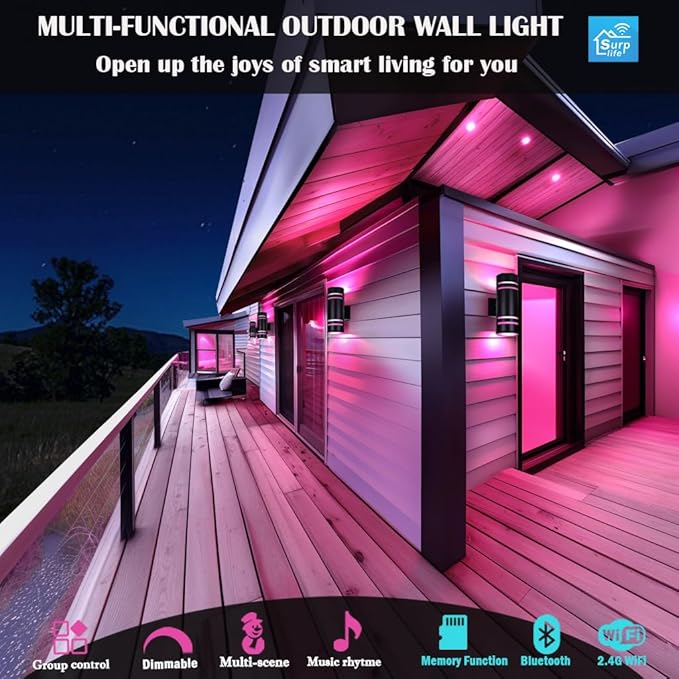 - Multiple Control Options: Exterior wall light fixtures offer various control methods, allowing you to connect via 2.4GHz WiFi or Bluetooth for app and voice control, compatible with assistants like Alexa and Google Assistant. Additionally, you can effortlessly control the RGB smart outdoor light fixtures using the Surplife app and third-party voice control without needing a hub. With the Surplife app, you can choose between individual or group control. You also have the option to use the included remote control for convenience.