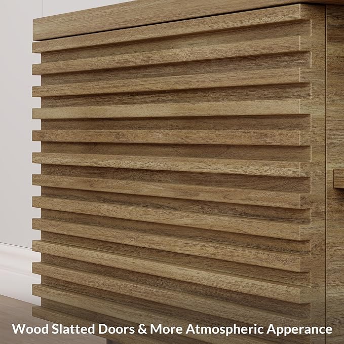 - [Modern TV Stand] - Elevate your living space with this TV media console table featuring a sleek slatted door design, adding an elegant touch to any room decor. The harmonious blend of camel main body and black bottom base exudes beauty and sophistication. With ample space under the bottom base, this entertainment center with storage makes cleaning effortless, ensuring a tidy environment at all times.