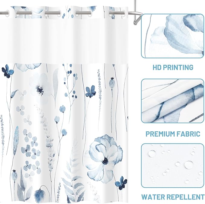 No Hook Shower Curtain with Snap in Liner - Floral Shower Curtain - Fabric Waterproof Inner Liner, Plants Watercolor Moonlight Blue Modern Cloth Shower Curtains - Machine Washable, 71 x 74