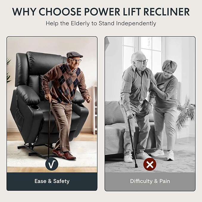 - 【Power Lift Chair for Seniors & Recovery】 – Ideal for elderly, post-surgery recovery, or anyone with knee, hip, or back issues, this electric lift chair makes standing up safe and effortless. The smooth, quiet motor gently tilts the chair forward with one button press, reducing strain on joints and helping you maintain independence at home.