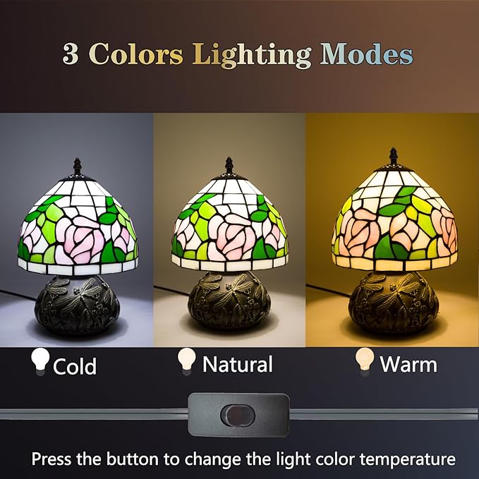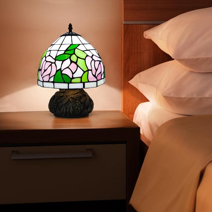 Small Tiffany Stained Glass Lamp, 3 Color Temperatures Bedside Lamp, 8 Inch Mushroom Desk Light for Bedroom Living Room Office Home Decor (Pink Rose)