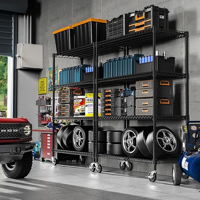- HEAVY DUTY STORAGE SHELF: Our storage shelf is made of sturdy carbon steel and 25.4mm metal rods and each shelving unit holds up to 440 LBs on leveling feet, with a total bearing capacity of 1760/2200LBs (Approximately 530 LBs on wheels.)