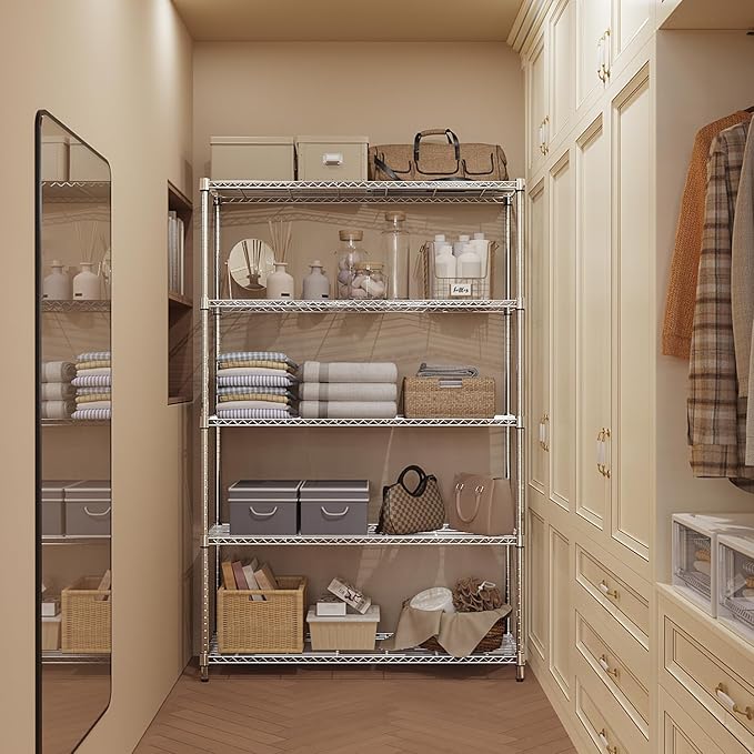 MZG 1750 lbs 5 Tier Storage Rack Metal Wire Shelving Unit, Storage Standing Household Shelf Organizer for Kitchen Pantry Closet Garage Basement Utility Room, Chrome 15.8" D x 45.3" W x 70.4" H