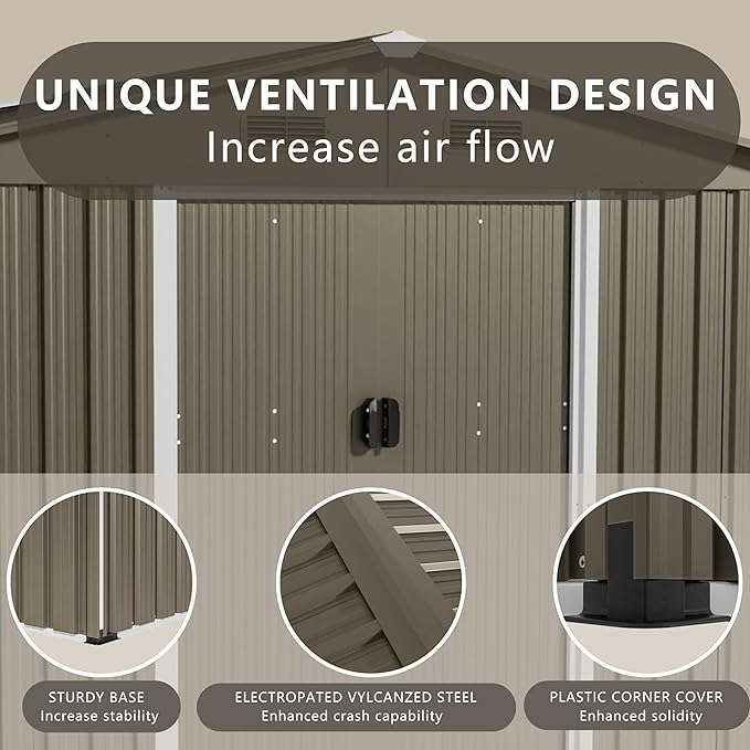 - Durable and practical: The metal storage shed is constructed of galvanized steel, with a sturdy overall structure. The exterior of the shed with sliding doors and ventilation openings is painted to prevent ultraviolet radiation. The sloping roof and arched aluminum panels enhance waterproofing performance.