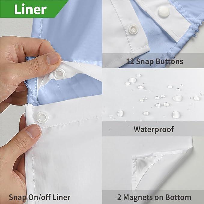 - 【Shower Curtain with Snap-On Liner】:This snap-on fabric shower curtain liner is easily detachable, making it convenient for cleaning or replacement.Equipped with 2 magnets at the bottom corners for added stability and to prevent splashing