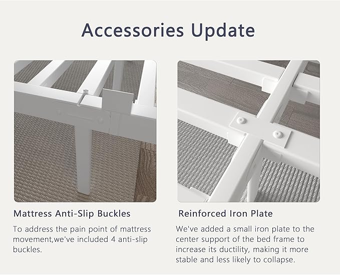 - 【Round Legs & Easy Assemble】 The white queen bed frame is designed with round corner legs, which can ensure safety and prevent injuries from accidentally hitting the corners. The metal bed frame queen size is easy to install, we configure the parts and tools, follow the steps in the instructions, it can be quickly assembled and disassembled very conveniently. Note: The no squeak bed frame does not include a mattress.
