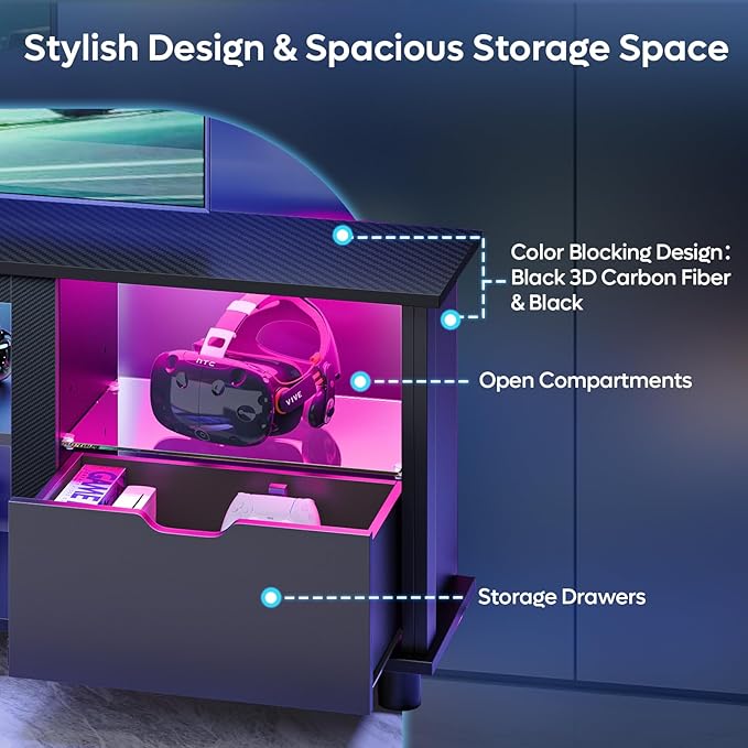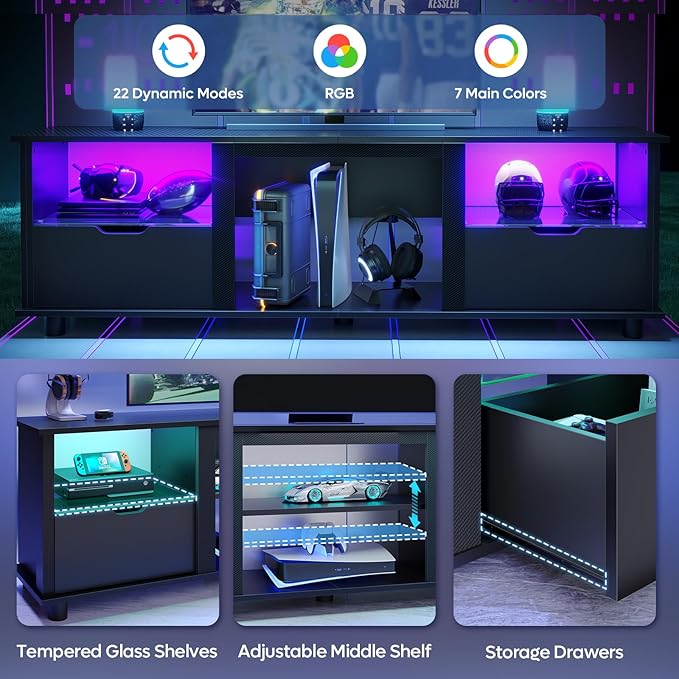 - TV Stands with LED Lights: Enhance your gaming experience with this TV stand featuring vibrant RGB LED strips controlled effortlessly with a wireless remote. Choose from 7 main colors and 22 dynamic modes to personalize your space, creating an electrifying ambiance that delivers an immersive viewing experience like never before