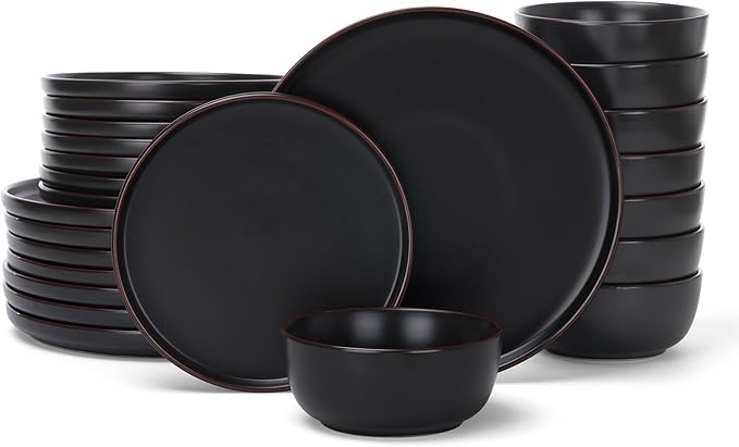 Famiware Mercury 24 Pieces Dinnerware Sets, Plates and Bowls Sets for 8, Microwave and Dishwasher Safe Dish Set, Black