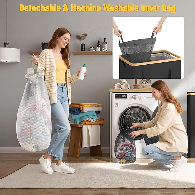 - 【With 2 Removable Bags 】This clothes hampers for laundry equipped with 2 areas and 2 removable bags, You can partition your different clothes andtake the clothes out without moving the whole dirty clothes hamper and carry the clothes to the laundry room, bathroom and other places easily with this inner bag