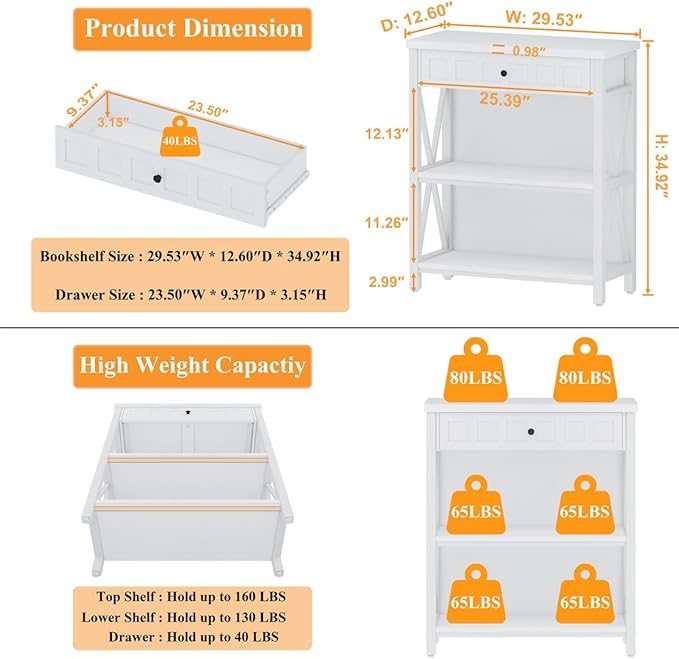 - [Impressive Stability & Weight Capacity] Thanks to additional support rods under lower shelf, this low bookshelf stands stable and secure after assembly. The weight limit of the shelf top is 160 lbs, and the lower shelf is 130 lbs. The drawer can handle up to 40 lbs. We have also added adjustable levelers on each leg to achieve perfect flatness