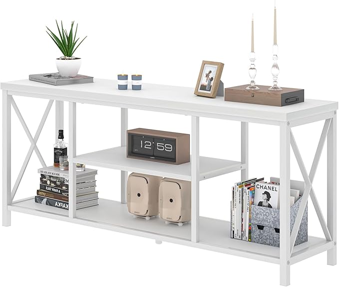 - Versatile TV Console Table: Designed with 3 tiers and 4 open compartments, this entertainment center and TV console offers ample space for your media equipment, CDs, DVDs, cable boxes, and books. White tv stand supports TVs up to 65 inch, helping to keep your living room, bedroom or entryway well-organized and clutter-free.