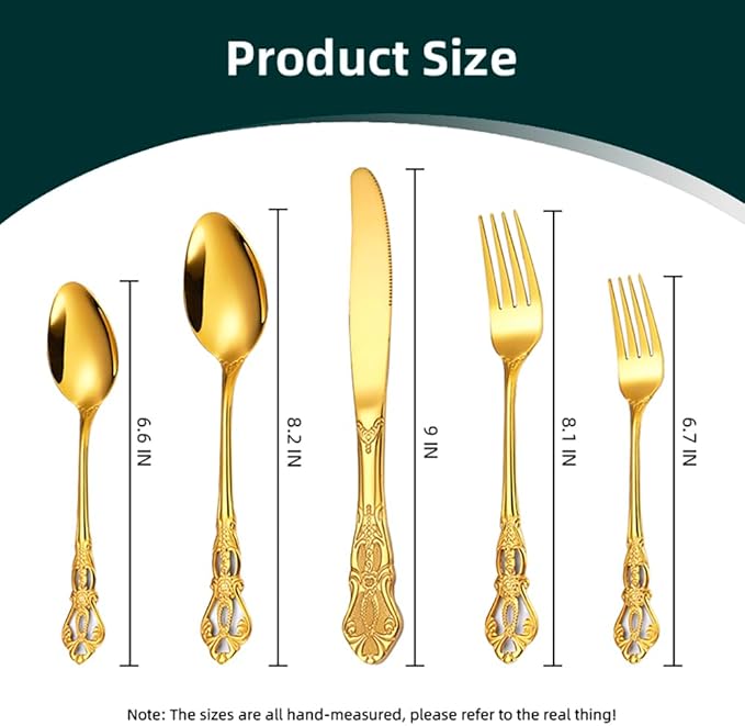 - LUXURY ROYAL DESIGN: Vintage royal design, exquisite embossed, add more elegance and classical atmosphere to your dining table. High mirror polishing, smooth edge and no burrs, ensuring your mouth safe and enjoying a pleasant dining experience.