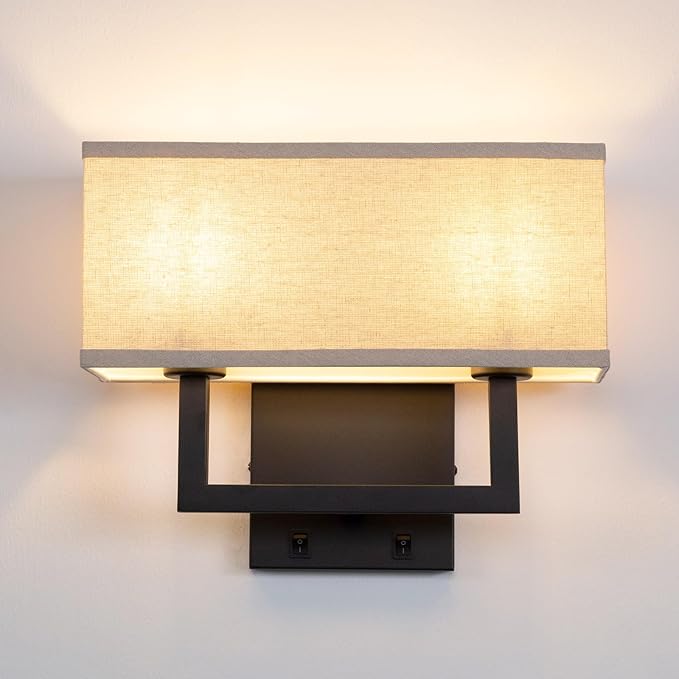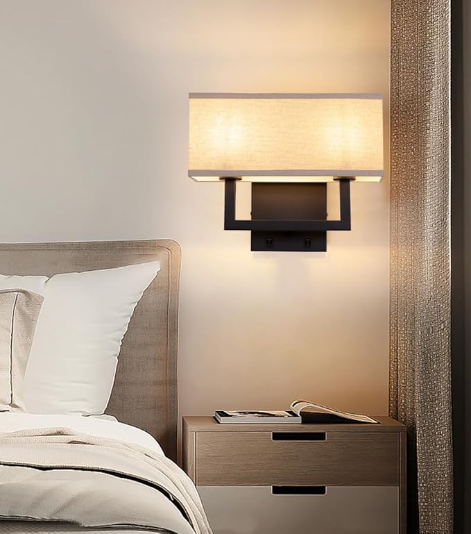 Yosoan Linen Fabric Boho Wall Sconce Bedside Light with On Off Switch, 2-Light Finished Hardwired Vintage Industrial Dual Wall Mount Lamp Lighting Square Shade for Bedroom Living Room Stairwell(Black)
