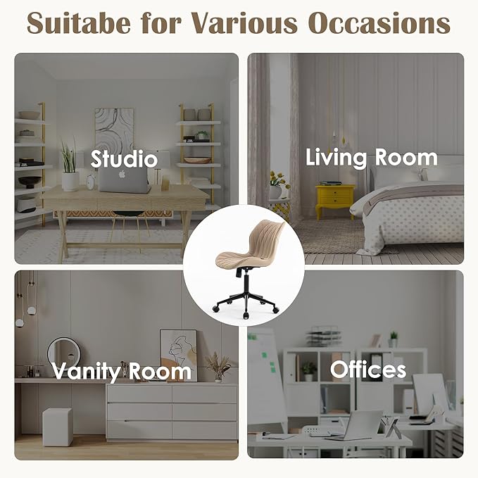 YOUNUOKE Armless Desk Chair Comfy Office Chair with Wheels Home Ergonomic Task Chair Adjustable Computer Chairs Modern Faux Leather Swivel Chair Upholstered Makeup Vanity Chair with Back(Khaki)