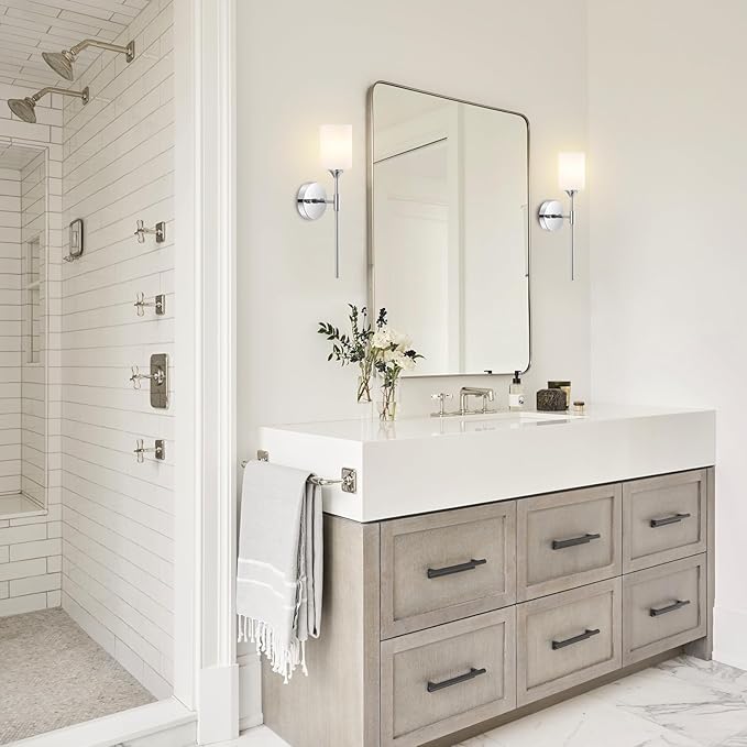Modern Wall Sconce Set of 2 White Cylinder Glass Shades Mid Century Bathroom Vanity Wall Light Fixtures Industrial Wall Lamp for Bedroom Mirror Living Room Restaurant(Chrome Color)