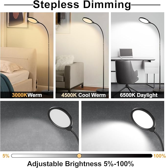 - 【Stepless Dimming & Smart Memory】Unlike other dimmable floor lamps, ours modern tall lamps feature 10%-100% stepless dimmable brightness and 3 color temperature options (warm, warm white, white) ranging from 3000K to 6500K. Reading light for living room corner smart memory function retains your last brightness and color temperature settings, and a timer function to automatically turn off after 30 minutes or 1 hour, adding convenience to your daily life.