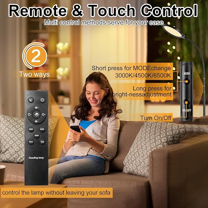 - 【Remote & Touch Control】Our LED standing lamp includes advanced RF remote control with an impressive range of around 49ft, allowing you to adjust lighting from various rooms. The magnetic remote control can stick to the metal pole, wall plate, or fridge, making it easier to be reached. When the reading floor lamp remote is out of power, the touch switch comes to the rescue.