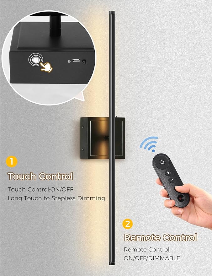 - 【Remote and Touch Control】These wall sconces set of two battery operated offer two control methods: touch control and remote control. You can manage all settings with the remote, including on/off and stepless brightness adjustment. There's a touch switch on the wall box, a single touch controls the power, while a long press adjusts the brightness.