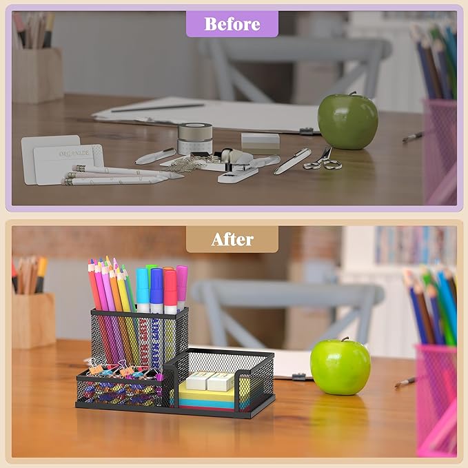 - [Reduces Clutter] This desk organizers provide enough storage space to accommodate your desk supplies and also ideal for organizing makeups and small household items. No installation needed, light material, portable, more than just your average desk pen holder.