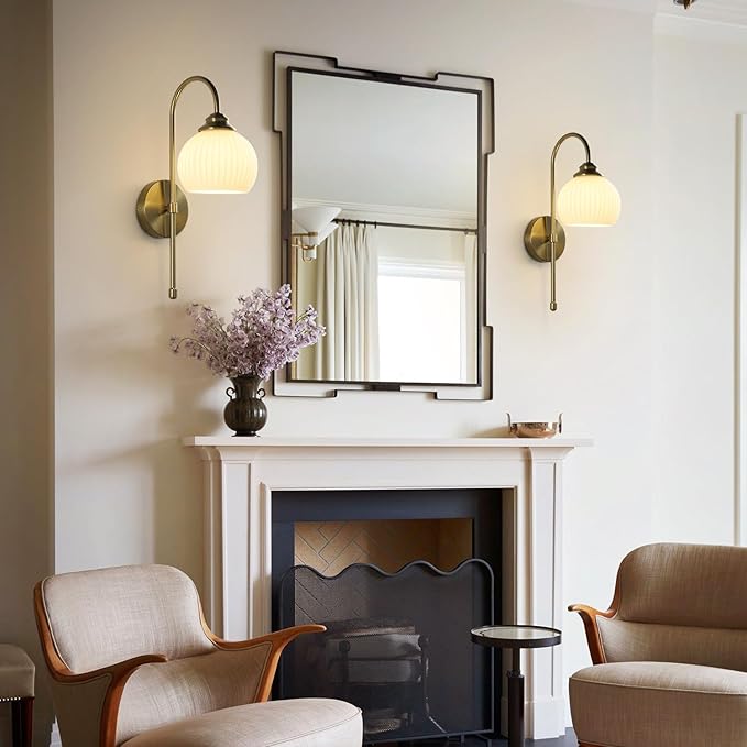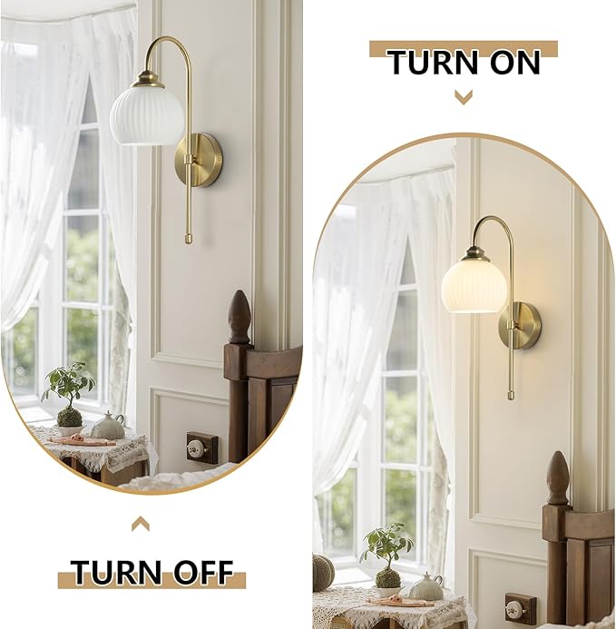 - Vintage Wall Sconces with White Tone: The gold slim wall sconces with white lampshade is made of brushed finish arc metal lamp body and milk glass, the glass texture is clear and can penetrate the light well, and the white glass softens the light. Unique arc design adding a touch of simple and stylish flair to your space. This brushed gold bathroom wall sconces is suitable for various decoration styles, making it the perfect choice to enhance your home lighting