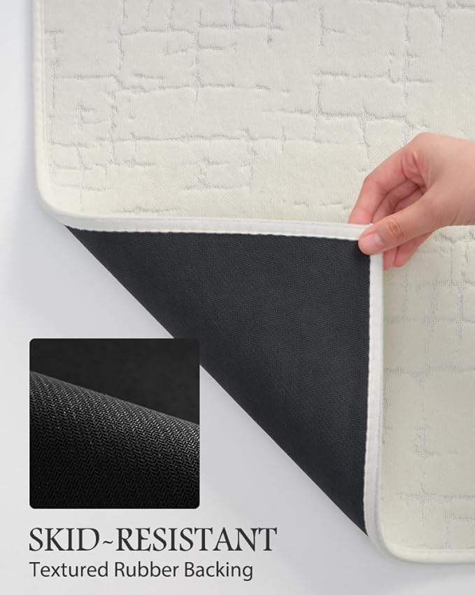 - LOW PROFILE & FLAT: Thin bathroom rug fit under door. Proper thickness for robot vacuum cleaner and wheelchair. Rolling package without stubborn creases. No shedding, no pilling and no fading will happen. It can be laundry room mat, kitchen mat, pet feeding mat, desk mat, in front of sink mat, rv bath mat etc