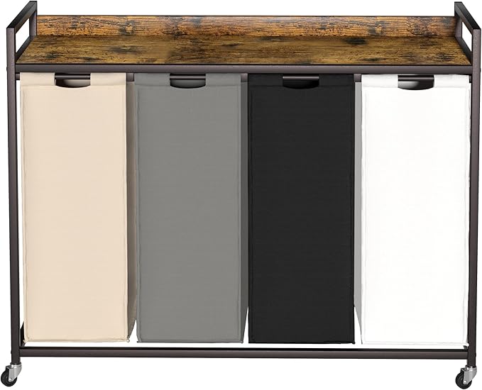 Laundry Hamper with Shelf, Laundry Basket 4 Section, Laundry Sorter with Pull-Out Removable Large 4 Color Bags and Movable Wheels, Metal Frame, 4 x 15.87 Gallons (60L), Rustic Brown PF07XLN