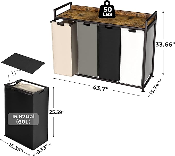 - Large capacity design - Overall dimensions: 43.7 L*15.74 W*33.66 H inches, individual bag dimensions: 9.33 L*15.35 W*25.59 H inches (15.87 gal/60L). This laundry basket features a four-color large capacity design, making it easy to distinguish and organize your clothes. Whether you want to separate clothes by different colors or separate underwear, jackets, and pants, it can meet your needs.