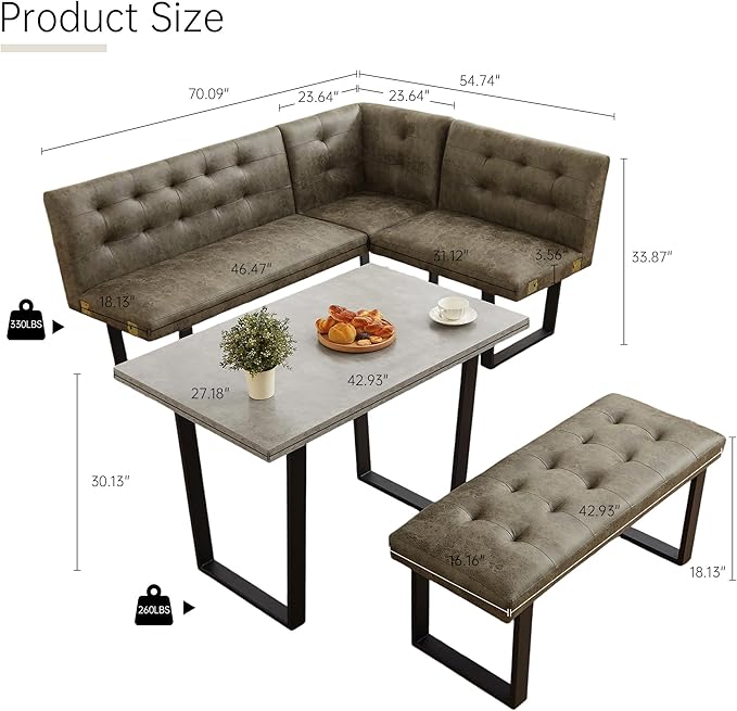 - Space-Saving Corner Design: This 3-piece breakfast nook set fits snugly in corners, saving space while comfortably seating 4-6 people. The upholstered bench can be paired with extra chairs, and the corber bench can be assembled in left or right positions to match your kitchen or dining room layout.