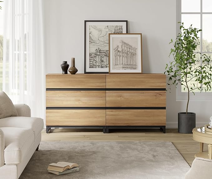 WAMPAT Modern TV Stand for TVs up to 70 inch, Entertainment Center TV Console Table with 6 Drawers and Metal Base, Media Console for Living Room, Bedroom, Oak