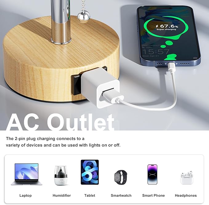 - Bedside Lamps Set with Practical AC Outlet - This modern bedroom lamps kit provides a convenient AC outlet that eliminates the need for additional power outlets, simplifies desktop wiring, and keeps your desk tidy. The two-pin plug is always available for connection to other devices, such as your cell phones, tablets, laptops, humidifiers, smart watch and more, regardless of whether the matching bed lamp is on or off. This compact night lamp is ideal for small office or study environments