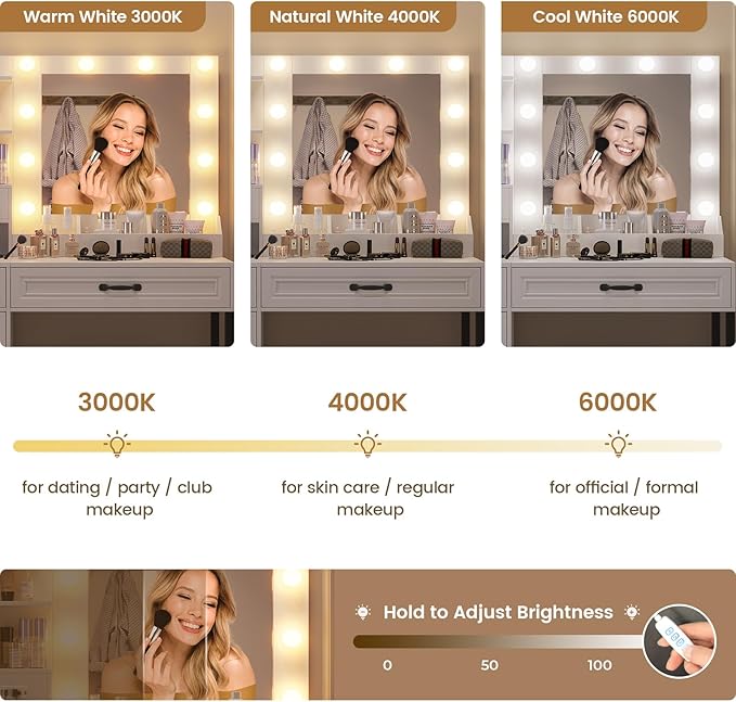 - 【Vanity Desk with 10 Hollywood Lights】10 (yes, TEN!) Hollywood lights around your mirror, giving you that perfect glow for makeup, selfies, and everything in between. A HUGE mirror so you can check out your outfit and makeup from every angle. No more squinting into tiny mirrors