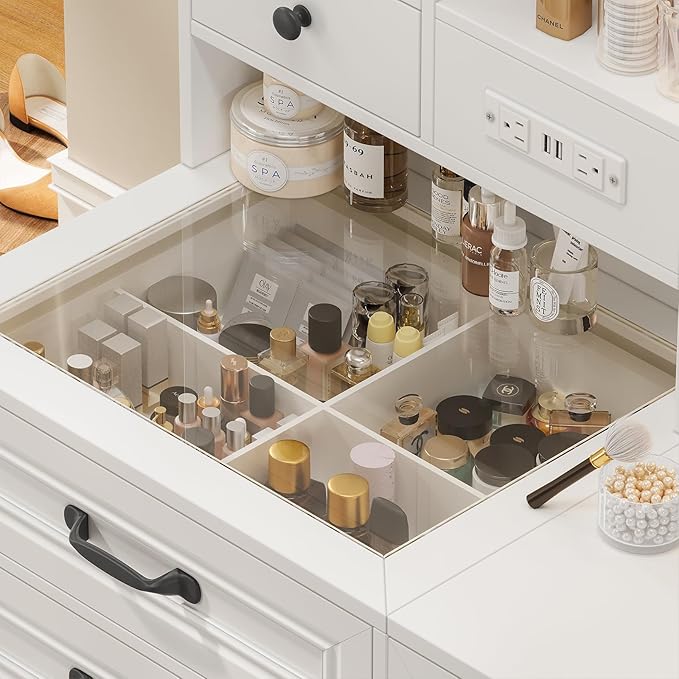 - 【Glass Top Vanity with Drawer Dividers】This vanity features a clear glass top, revealing what's inside the lower drawer. The clear safety glass top helps you find what you need. Time Saver!