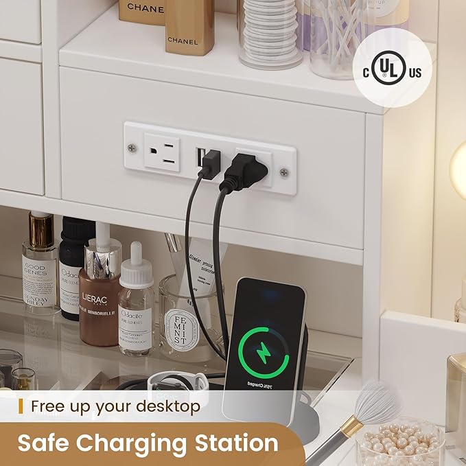 - 【Makeup Vanities with Charging Station】The built-in plug has 2 AC outlets & 2 USB ports. Charge your phone, tablet, or any device right at your vanity. Say goodbye to the hassle of finding outlets, and hello to convenience!