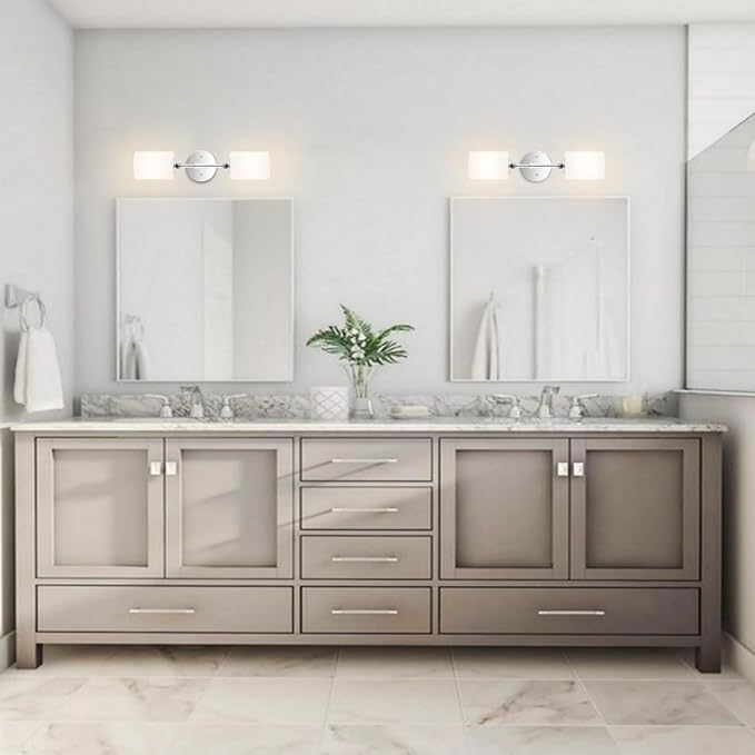 2-Lights Modern Wall Sconce White Cylinder Glass Shades Mid Century Bathroom Vanity Wall Light Fixtures Industrial Wall Lamp for Bedroom Mirror Living Room Restaurant(Chrome Color)