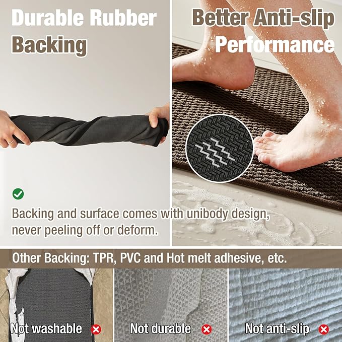 - Upgraded Non-Slip Backing: Our bathroom mats feature natural rubber backing, increasing slip resistance of a floor surface. They tightly grip smooth surfaces without skidding, and hence prevent and reduce the risk of falls for kids and the elderly. Say goodbye to slippery PVC/TPR bathroom mat—step out safely with our secure, stable design