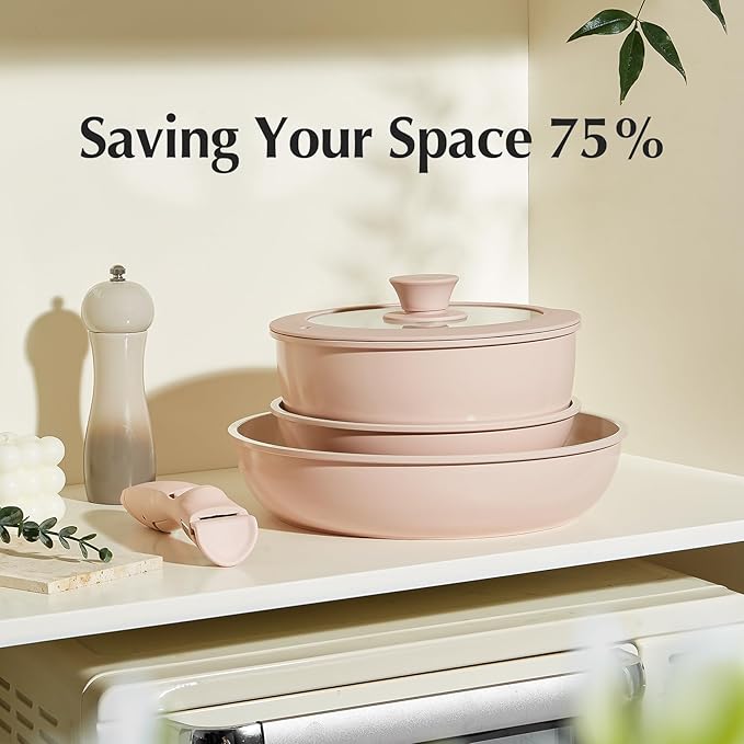 - 75% Space-Saving: Save up to 75% more space with stackable pots and pans set and detachable handles; Neatly stack all the pots and pans, saving 75% of cabinet space—keeping the kitchen organized and tidy
