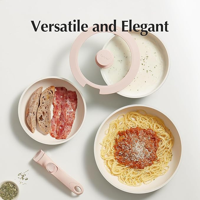 Redchef Ceramic Cookware Set, Removable Handle Pots and Pans Non-Stick, Rv Cookware Set, Non-Toxic Pots and Pans Set No PFAS, PTFE, PFOA, Detachable Pots and Pans, Dishwasher & Oven Safe (Pink)