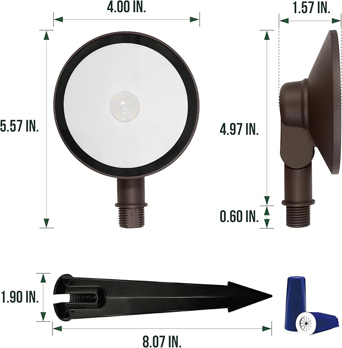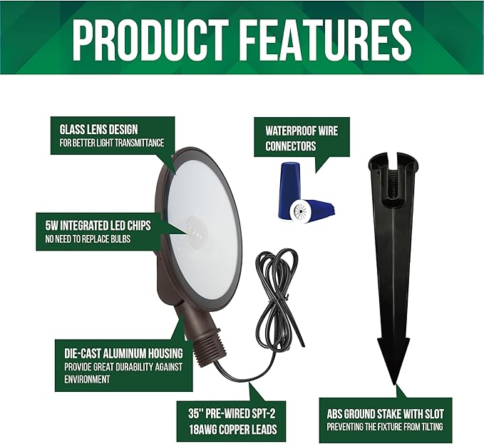 - Easy Installation and Maintenance: With a user-friendly design, installation is a breeze. The fixture can be easily ground mounted with 2pcs wire connectors (1 #14 w/1-3 #18 or 20 or 2 #14 w/1 #18), 2pcs screws, 36" pre-wired lead & waterproof wire nuts included in each package.